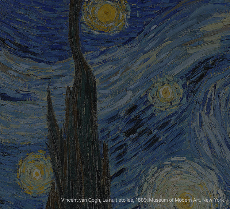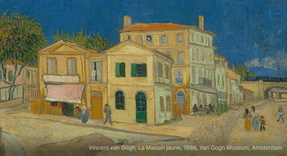 빈센트 반 고흐Vincent van Gogh, 1853.03.30 – 1890.07.29빈센트 반 고흐는 어린 나이부터 그림을 그렸다. 그는 예술에서 자신의 뿌리를 찾고 27세의 나이에 화가가 되기로 한다. 초기 반 고흐는 주로 풍경화를 그렸고 헤이그에 정착했었으나, 1884년 부모님 집으로 돌아와 일상적인 장면들을 화폭에 담으며 새로운 삶에 전념했다. 그는 예술과 색채에 대한 연구를 확장해 나갔다. 이 연구는 1888년 그가 빛과 색채가 가득한 아를(Arles)로 여행을 떠나면서 실행되었다. 그 해 10월 고갱(1848 – 1903)과 공동 작업을 시작했고 협업은 2개월 만에 끝났음에도 이들은 이후 지속적으로 서신을 교환했다.