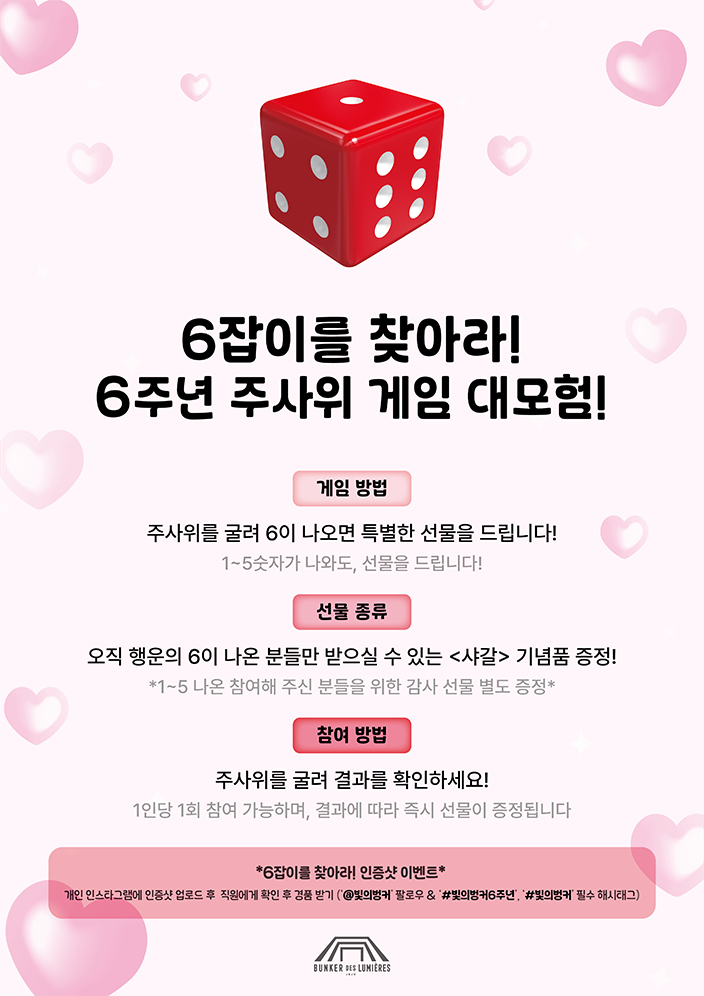 빛의 벙커 개관 6주년 기념 6잡이 이벤트 이벤트 상세 정보 기간 2024.11.16 ~ 2024.11.16 경품 샤갈 기념품 등 당첨자 발표 2024.11.16 16:00 이벤트 안내 빛의 벙커 개관 6주년을 맞아 오는 2024년 11월 16일 하루동안 특별한 이벤트를 진행합니다! 많은 관심 부탁 드립니다. 목록