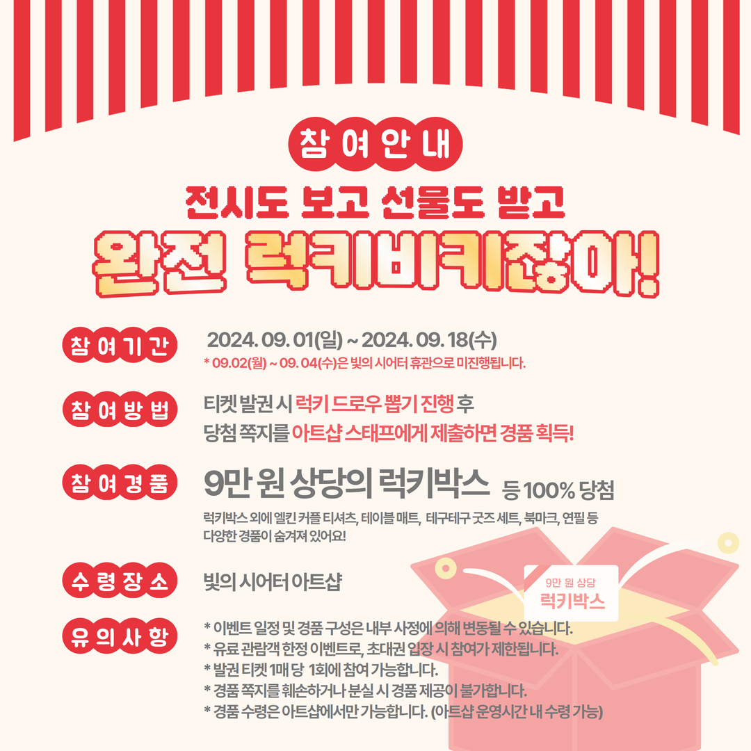 #EVENT – 완전 럭키비키잖아! 럭키 드로우 이벤트 다가오는 9월, 풍성한 이벤트가 가득한 전시도 보고 선물도 받는 🎁 9만 원 상당의 럭키박스부터 📌빛의 시어터 완전 럭키비키잖아! 이벤트 ✅ 이벤트 유의사항
