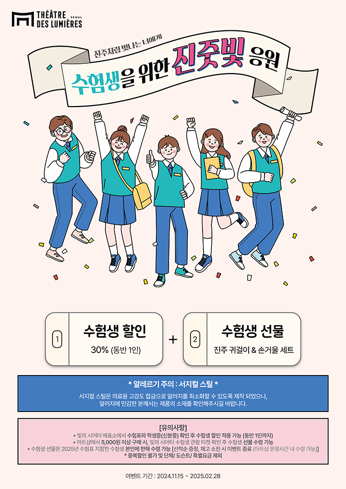 이벤트 기간 : 2024년 11월 15일 - 2025년 2월 28일 유의 사항 ✅ 빛의 시어터 매표소에서 2025학년도 수험표와 학생증(본인 신분증) 확인 후 수험생 할인 적용 가능(동반 1인까지 할인 적용) ✅ 아트샵에서 5,000원 이상 구매 시, 빛의 시어터 수험생 관람 티켓 확인 후 수험생 선물 수령 가능 ✅ 수험생 선물은 2025학년도 수험표 지참한 수험생 본인에 한하여 수령 가능(선착순 증정, 재고 소진 시 이벤트 종료, 아트샵 운영시간 내 수령 가능) ✅ *알레르기 주의 - 서지컬 스틸* : 서지컬 스틸은 의료용 고강도 합금으로 알러지를 최소화할 수 있도록 제작 되었으나, 알러지에 민감한 분께서는 제품의 소재를 다시 한번 확인해 주시기 바랍니다. ✅ 중복할인 불가 및 단체, 특별요금, 도슨트 제외  |