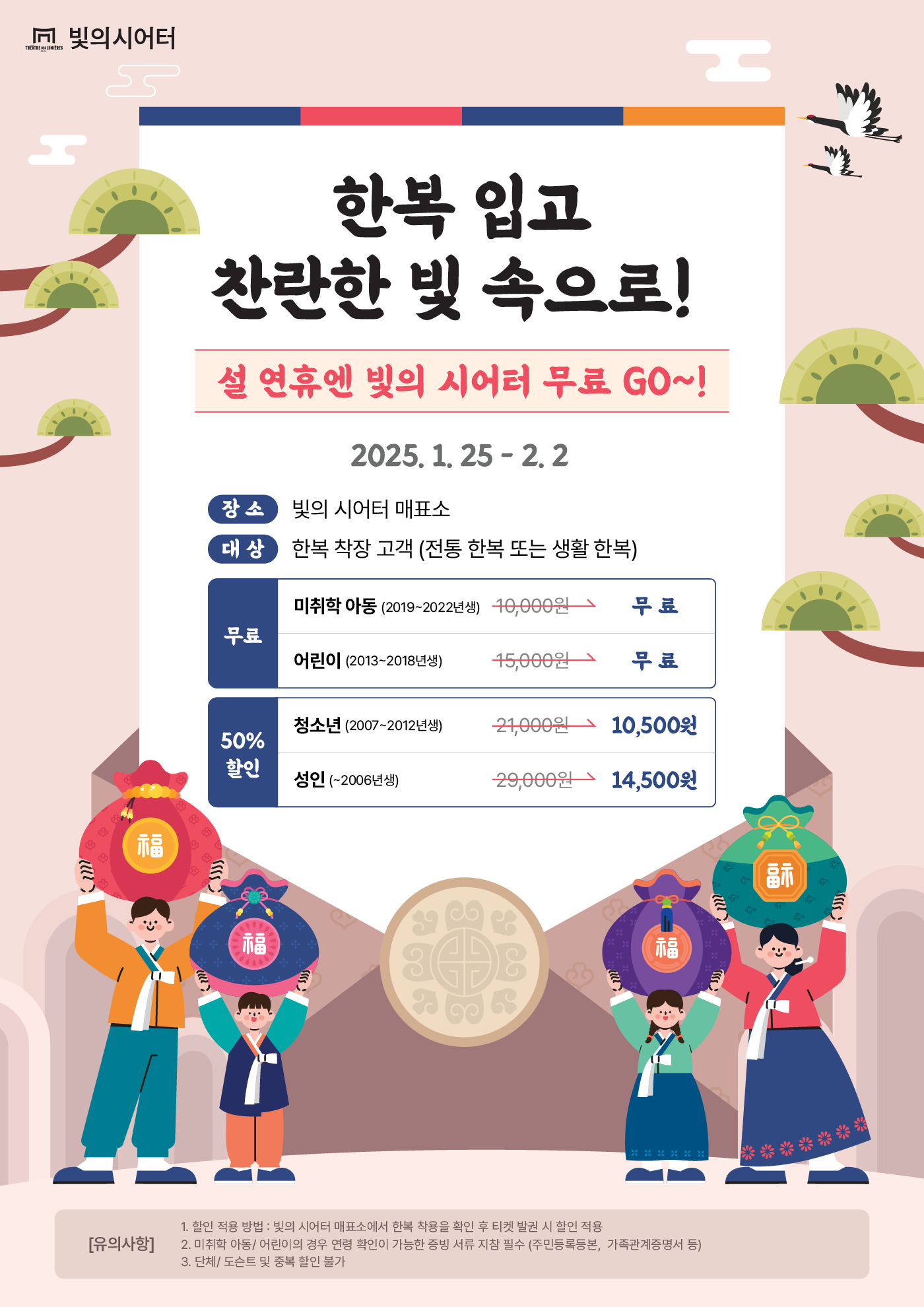 🔸이벤트 기간 : 2025년 1월 25일(토) - 2월 2일(일) 🔸이벤트 장소 : 빛의 시어터 매표소 🔸이벤트 대상 : 한복 착용 고객(전통 한복 또는 생활 한복 가능) 📌 미취학 아동(2019 - 2022년생) / 어린이(2013 - 2018년생) : 무료 📌 청소년(2027 - 2012년생) : 10,500원(50% 할인) / 성인(~2006년생) : 14,500원(50% 할인)