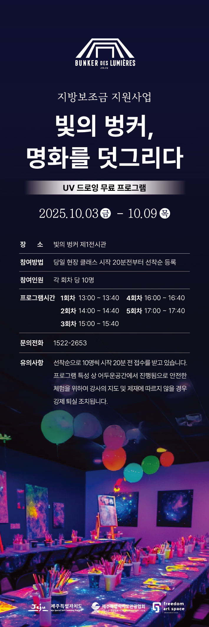행사 빛의 벙커, 명화를 덧그리다 UV 드로잉 무료 프로그램 신청 기간 2025.10.03 ~ 2025.10.09 일시 2025.10.03 13:00 대상 전 관람객 대상 (선착순) 장소 빛의 벙커 제1전시장 참가비 무료 강사 프리덤아트스페이스 목록